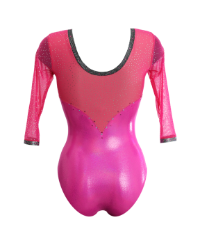 SPIRIT PLUS. Leotard from the Gold Plus collection with three-quarter sleeves made of hologram lurex with sweetheart neckline and central hologram lurex embroidery. The sleeves and yoke are in glittery tulle which is embellished and illuminated with rhinestones. Super elegant and feminine leotard to be at the top on the competition field.