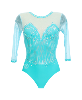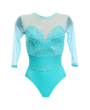 ÉLAN. Capo dallo stile sofisticato ed etereo, realizzato in lycra azzurro acqua con maniche e parte superiore in tulle trasparente. La decorazione principale consiste in una cascata di strass verticali a imitazione di frange luminose, che creano un effetto dinamico durante i movimenti. Ideale per performance ad alto impatto visivo.