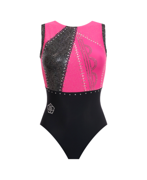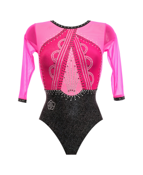 GIRLIE LOOK. Capo ad altissimo impatto visivo, in lycra rosa fluo e lycra nera glitterata nella parte inferiore. La zona del busto è impreziosita da una lavorazione centrale simmetrica in strass, ispirata a motivi barocchi e geometrici. Le linee verticali e i riccioli di strass donano slancio e raffinatezza, esaltando la figura dell’atleta.