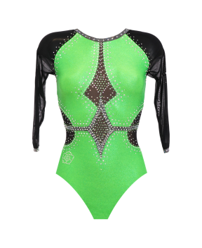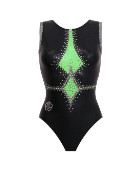 TENSIA.  Realizzato in tessuto nero iridescente altamente performante, questo capo è arricchito da dettagli geometrici verde fluo rifiniti con cristalli brillanti. La struttura smanicata offre supporto e libertà di movimento, mentre il taglio sagomato valorizza la figura, rendendolo adatto a performance sceniche di grande impatto visivo.