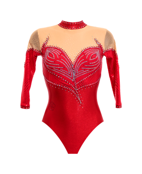 APPEAL.  Forte e teatrale, questo capo è pensato per atlete che vogliono dominare la scena. Realizzato in lycra metallizzata rosso fuoco, è arricchito da maniche e décolleté in tulle nude, su cui spiccano motivi a fiamma realizzati con strass rossi e neri. Il collo alto, chiuso sul retro, aggiunge un tocco di eleganza scenica.