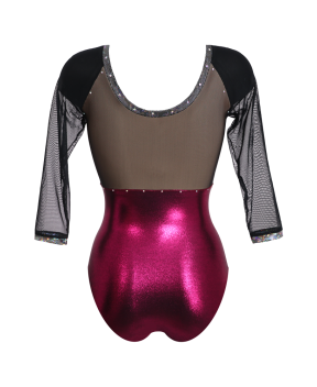 OVAL DARK CYCLAMEN. Body con maniche raglan a tre quarti in lurex con tulle elasticizzato e ricamo in silver lurex hologram. Il design a con scollatura a cuore centrale glamour ed elegante valorizza la figura ed è impreziosito da file di strass, che conferiscono una raffinata luminosità.