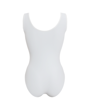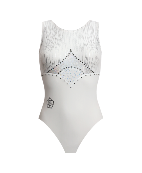 BAND WHITE. Body smanicato in lycra, con girocollo e giromanica elasticato, inserti in lurex hologram. Il design esalta il busto donando eleganza ed è impreziosito e illuminato da una linea di strass.