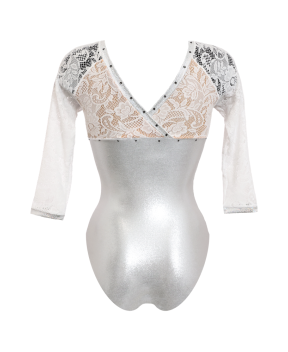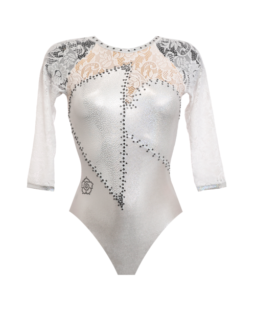 FUNKY WHITE. Body della Collezione Lace a girocollo con maniche a tre quarti raglan in lurex, lurex hologram e pizzo elasticizzato. Il design asimmetrico con scollatura a cuore dona eleganza e femminilità alla figura sottolineando il punto vita e presenta una scollatura incrociata sulla schiena. Il body è impreziosito ed illuminato da file di strass. Body super elegante e femminile per essere al top in campo gara.