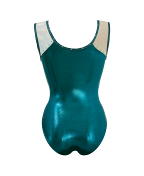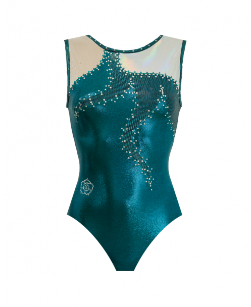 PROMO GREEN JOY. Body smanicato in lurex petrol, black petrol, silver cangiante e tulle glitterato con applicazione di strass crystal e blue zircon. Il design asimmetrico si sposa al ricamo flame dal colore deciso evidenziando la parte alta del corpo con eleganza e luminosità.