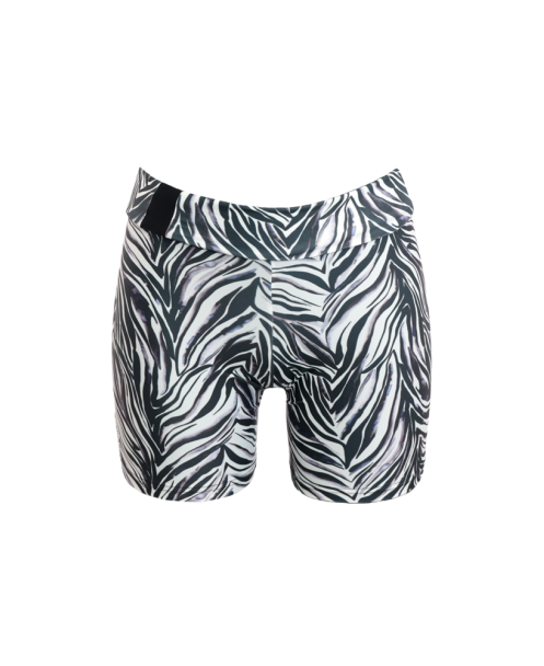 PANTS VESPERA. Shorts in lycra fantasia animalier nero-bianca con fascia alta da portare anche risvoltata. Pantaloncini abbinabili al body da training Vespera.