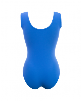 AZURE. Body realizzato per le Fiamme Oro in azzurro ortensia. Il body con scollatura a cuore è smanicato con elastici e ha un ricamo centrale simmetrico che evidenzia la parte alta del corpo ed è contornato da una fila di strass Preciosa crystal aurora boreale che illumina e impreziosisce il capo.