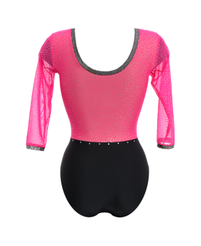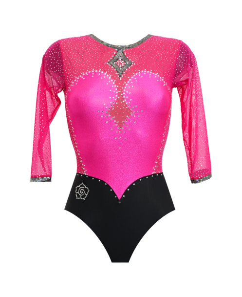 ARRIS FUCHSIA. Body con maniche a tre quarti in lycra matt, lurex hologram e tulle elasticizzato glitterato. Il design simmetrico con scollatura a cuore centrale e taglio in vita allunga e sottolinea la parte alta del corpo donando eleganza e femminilità ed è contornato da file di strass che conferiscono luminosità e preziosità al capo.