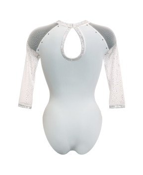 METAL WHITE. Body con maniche a tre quarti raglan in lycra matt, lurex hologram e tulle glitterato. Il design simmetrico con scollatura a cuore centrale e il taglio in vita sottolineano la parte alta del corpo donando eleganza e femminilità ed è contornato da file di strass che conferiscono luminosità e preziosità al capo.