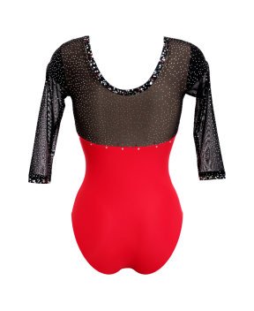 CELEBRITY RED. Body con maniche a tre quarti in lycra matt, lurex hologram e tulle glitterato. Il design asimmetrico e il taglio in vita sottolineano la parte alta del corpo donando eleganza e femminilità ed è contornato da file di strass che conferiscono luminosità e preziosità al capo.