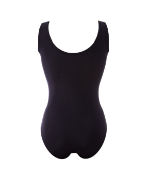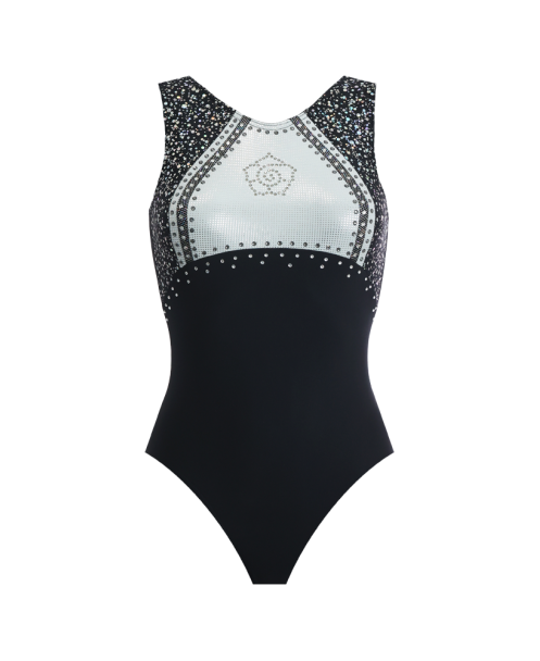 GRACE. Body smanicato in lycra con inserti in lurex hologram. Il design semplice evidenzia la parte alta del busto ed è contornato da file di strass crystal e black diamond che impreziosiscono ed illuminano il body rendendolo elegante.