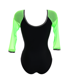 VIBES. Body con maniche a tre quarti raglan in lycra matt, lurex hologram e tulle elasticizzato. Il taglio in vita e il design a onde evidenziano la parte alta del busto donando eleganza e grinta allo stesso tempo ed è contornato da file di strass crystal e black diamond che conferiscono luminosità e preziosità al capo.