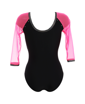 JANUS . Body con maniche a tre quarti raglan in lycra matt, lurex hologram e tulle elasticizzato. Il taglio in vita e il design simmetrico centrale evidenziano la parte alta del busto donando eleganza e grinta allo stesso tempo ed è contornato da file di strass crystal e black diamond che conferiscono luminosità e preziosità al capo.