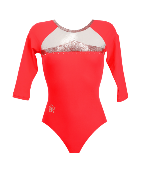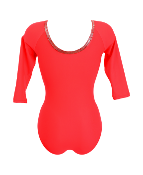 SPC BELL NEON RED. Body con maniche tre quarti raglan in lycra matt, con girocollo con bordo in lurex hologram e inserti in lurex hologram. Il design geometrico esalta la parte alta del corpo ed è impreziosito e illuminato da una linea di strass crystal.