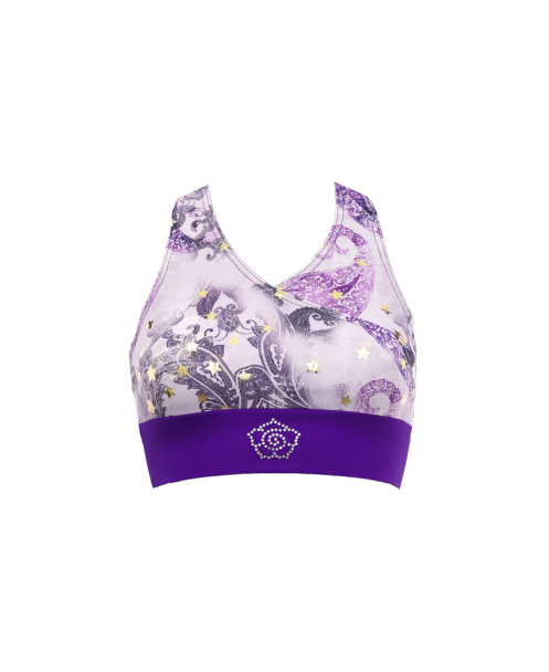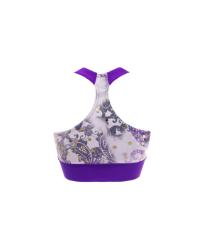 TOP STARS PURPLE. Top in lycra confortevole con stampa fantasia e stelle oro. Caratterizzato dalla scollatura davanti a incrocio a V. Logo Sigoa in strass crystal al centro della fascia. Top ideale per gli allenamenti più strong in palestra.