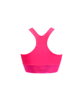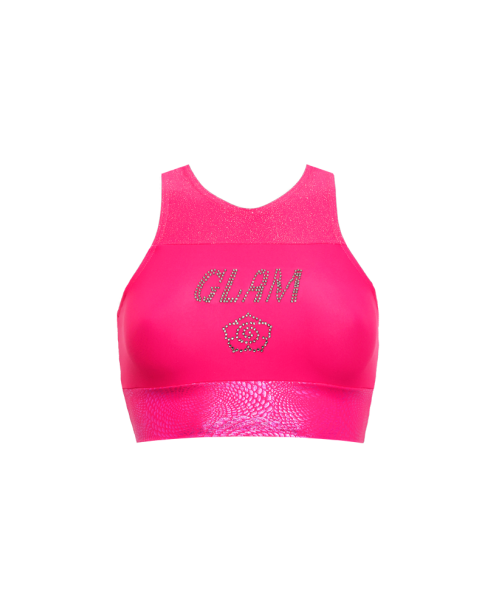 TOP GLAM FUCHSIA. Top in lycra confortevole con lycra glitterata e fascia in lycra lamina fantasia. Caratterizzato da una schiena olimpionica e con logo Sigoa e testo "Glam" in strass al centro. Top ideale per gli allenamenti più strong in palestra.