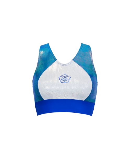 TOP SIRENA. Top in lycra confortevole e lurex laminato fantasia e cangiante. Caratterizzato da una schiena olimpionica in rete tecnica e con logo Sigoa in strass al centro del petto. Top super glamour per gli allenamenti più strong in palestra.