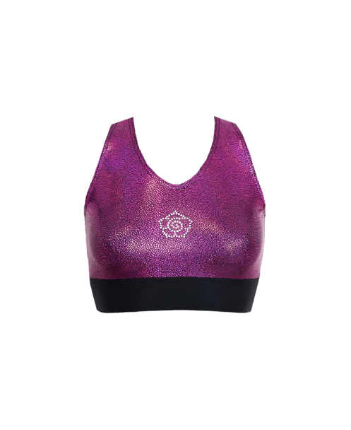 PROMO TOP CROISE' FUCHSIA. Top in lurex laminato fantasia caratterizzato da una schiena incrociata in rete tecnica e con logo Sigoa in strass al centro del petto. Top super glamour per gli allenamenti più strong in palestra.